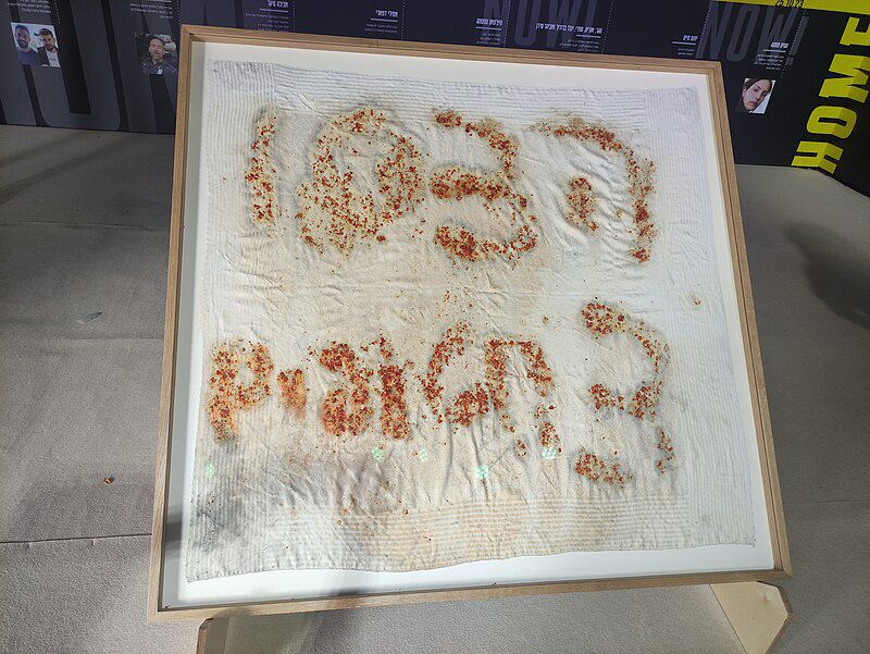 הבד, עליו רשמו השלושה 'הצילו - 3 חטופים' באמצעות תבלינים, מוצג במסגרת תערוכת 'מבעד לעיניהם' שיזמה קהילת כפר עזה לציון שנה לטבח ה-7 באוקטובר.